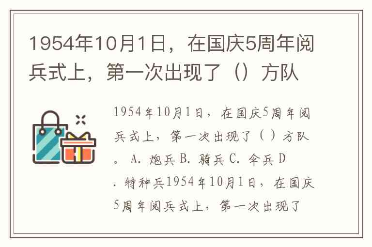 1954年10月1日,在国庆5周年阅兵式上,第一次出现了()方队。 A. 炮兵 B. 骑兵 C. 伞兵 D. 特种兵