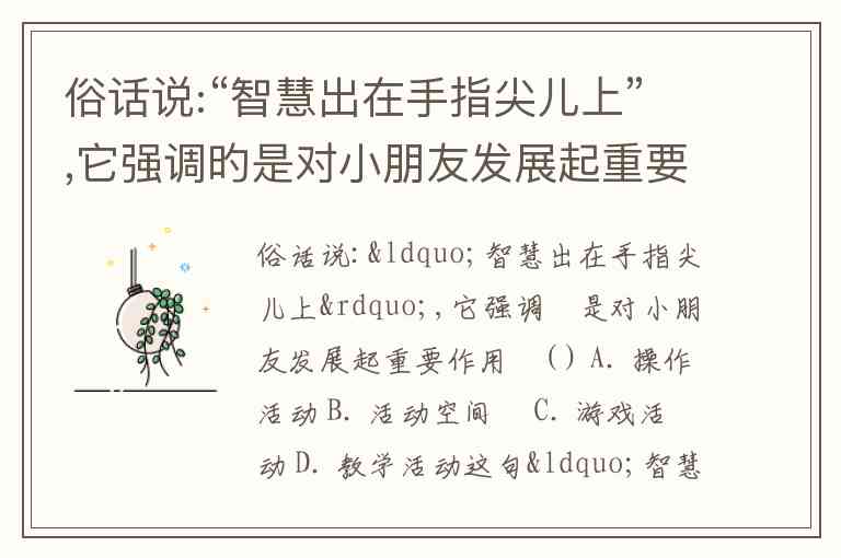 俗话说:“智慧出在手指尖儿上”,它强调旳是对小朋友发展起重要作用旳( ) A. 操作活动 B. 活动空间ﻩ C. 游戏活动 D. 教学活动
