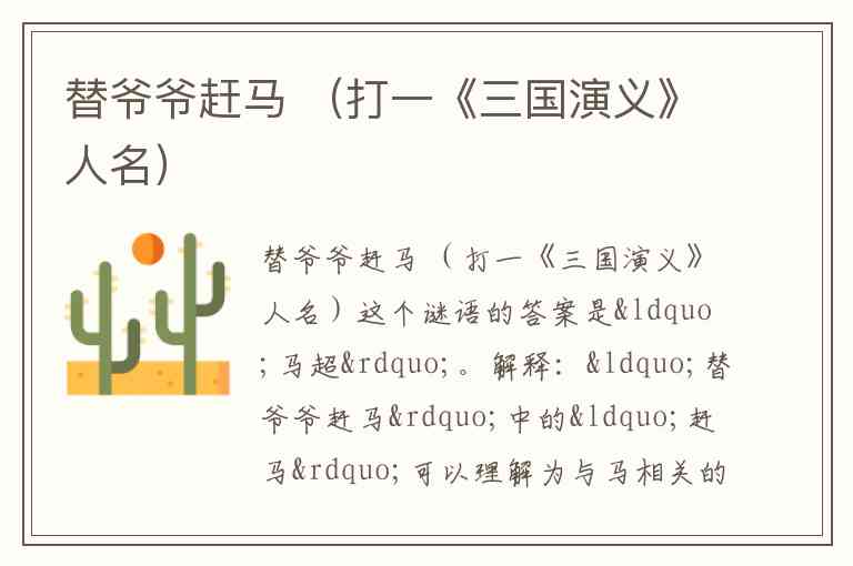解释:“替爷爷赶马”中的“赶马”可以理解为与马相关的动作,指的是马超。“马超”是三国时期著名的将领,字孟起,因为与马有关系,所以这个谜语通过“赶马”来指代他。