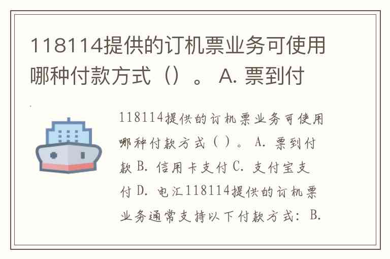 118114提供的订机票业务可使用哪种付款方式()。 A. 票到付款 B. 信用卡支付 C. 支付宝支付 D. 电汇