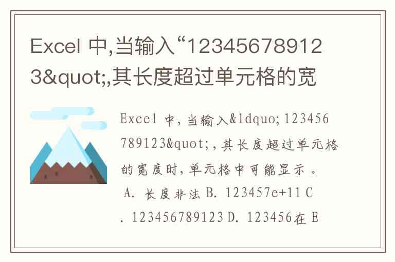 Excel 中,当输入“123456789123",其长度超过单元格的宽度时,单元格中可能显示 。 A. 长度非法 B. 123457e+11 C. 123456789123 D. 123456