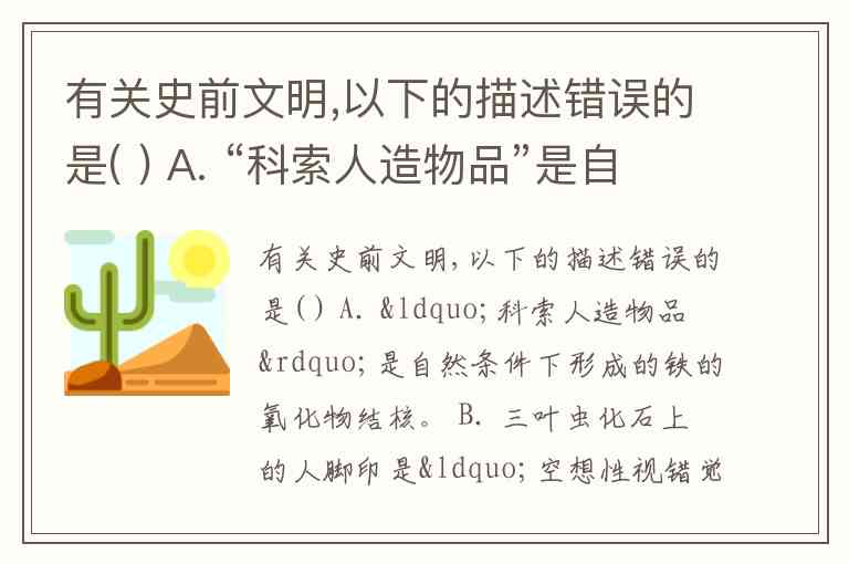 有关史前文明,以下的描述错误的是( ) A. “科索人造物品”是自然条件下形成的铁的氧化物结核。 B. 三叶虫化石上的人脚印是“空想性视错觉”导致的误认。 C. 探险家米切尔•海吉斯发现的声称是古代制造的水晶头颅其实是现代工艺品。 D. 在埃及发现的2500年前的木乃伊,体内装有心脏起搏器,代表了古埃及人当时的科技比较先进。