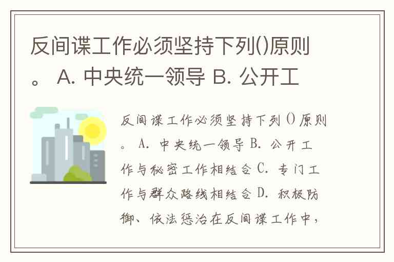 反间谍工作必须坚持下列()原则。 A. 中央统一领导 B. 公开工作与秘密工作相结合 C. 专门工作与群众路线相结合 D. 积极防御、依法惩治