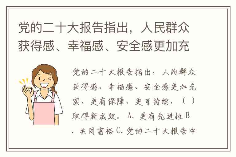 党的二十大报告指出,人民群众获得感、幸福感、安全感更加充实、更有保障、更可持续,( )取得新成效。 A. 更有先进性 B. 共同富裕 C.