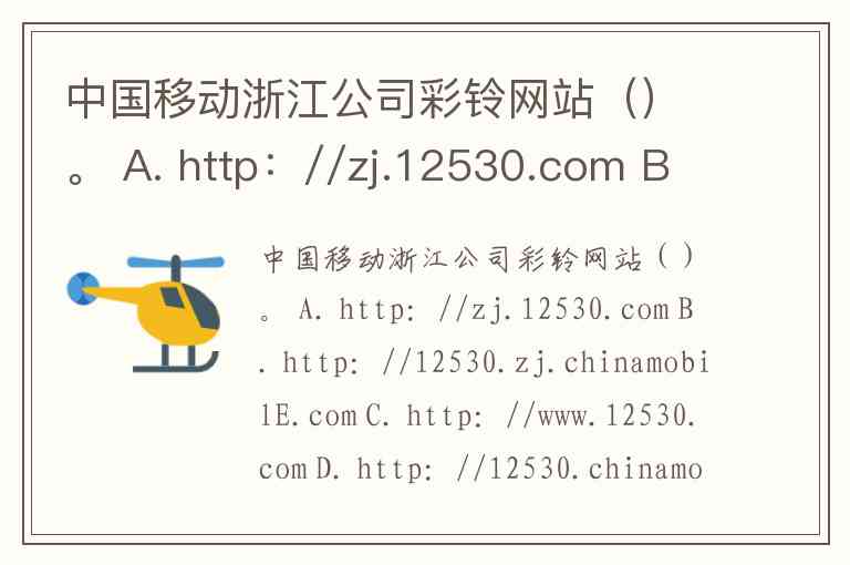 中国移动浙江公司彩铃网站()。 A. http://zj.12530.com B. http://12530.zj.chinamobilE.com C. http://www.12530.com D. http://12530.chinamobilE.cn
