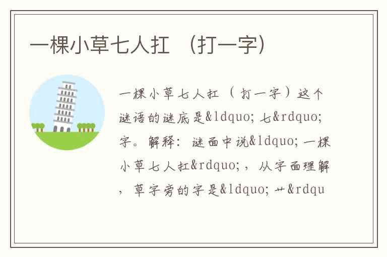 解释:谜面中说“一棵小草七人扛”,从字面理解,草字旁的字是“艹”,“七人”组成“人”字旁。把“草”和“人”组合在一起,构成了“七”字。