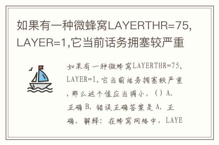 如果有一种微蜂窝LAYERTHR=75,LAYER=1,它当前话务拥塞较严重,那么这个值应当调小。( ) A. 正确 B. 错误