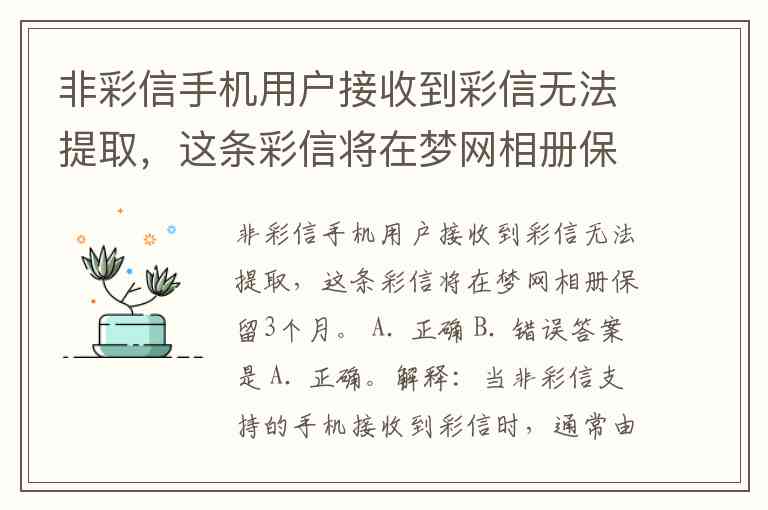解释:当非彩信支持的手机接收到彩信时,通常由于设备不支持或不具备提取彩信的功能,用户无法直接查看彩信内容。此时,彩信会保留在运营商的服务器(如梦网相册)中,通常保留时间为3个月。
