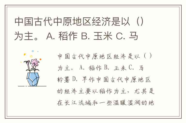 中国古代中原地区经济是以()为主。 A. 稻作 B. 玉米 C. 马铃薯 D. 旱作
