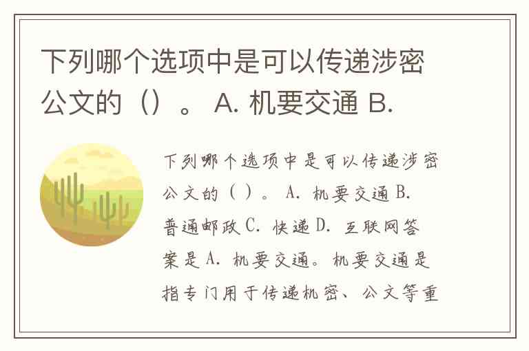 下列哪个选项中是可以传递涉密公文的()。 A. 机要交通 B. 普通邮政 C. 快递 D. 互联网