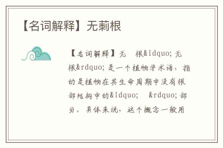 “无莿根”是一个植物学术语,指的是植物在其生命周期中没有根部结构中的“莿”部分。具体来说,这个概念一般用于描述一些没有根系结构或者根系退化的植物。