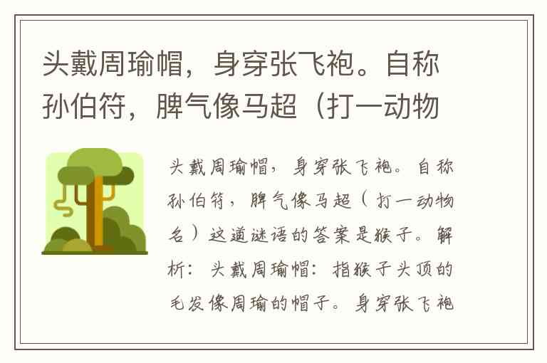 头戴周瑜帽,身穿张飞袍。自称孙伯符,脾气像马超(打一动物名)
