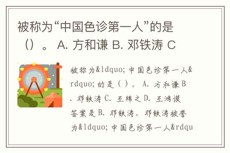 被称为“中国色诊第一人”的是()。 A. 方和谦 B. 邓铁涛 C. 王绵之 D. 王鸿谟