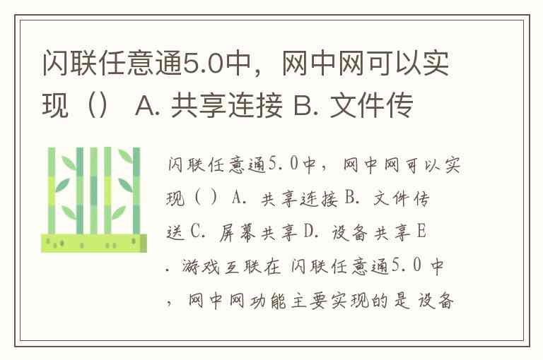 闪联任意通5.0中,网中网可以实现() A. 共享连接 B. 文件传送 C. 屏幕共享 D. 设备共享 E. 游戏互联