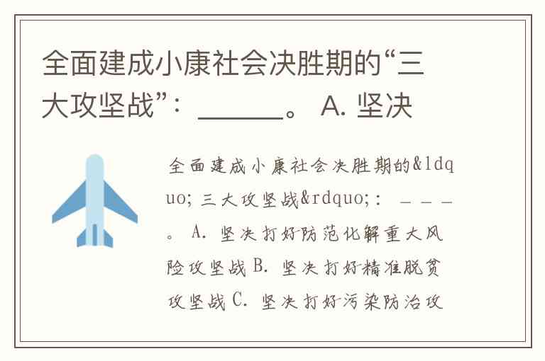 全面建成小康社会决胜期的“三大攻坚战”:___。 A. 坚决打好防范化解重大风险攻坚战 B. 坚决打好精准脱贫攻坚战 C. 坚决打好污染防治攻坚战 D. 坚决打好可持续发展攻坚战