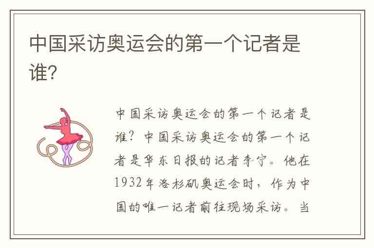 中国采访奥运会的第一个记者是华东日报的记者李宁。他在1932年洛杉矶奥运会时,作为中国的唯一记者前往现场采访。当时,中国并没有正式派遣代表团参赛,李宁作为中国媒体的代表,虽然语言不通,但依然克服种种困难,顺利完成了对赛事的报道。