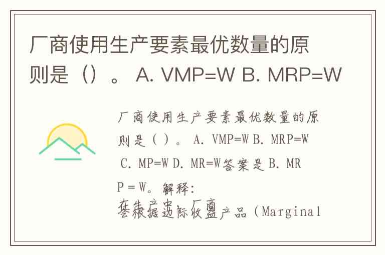 厂商使用生产要素最优数量的原则是()。 A. VMP=W B. MRP=W C. MP=W D. MR=W