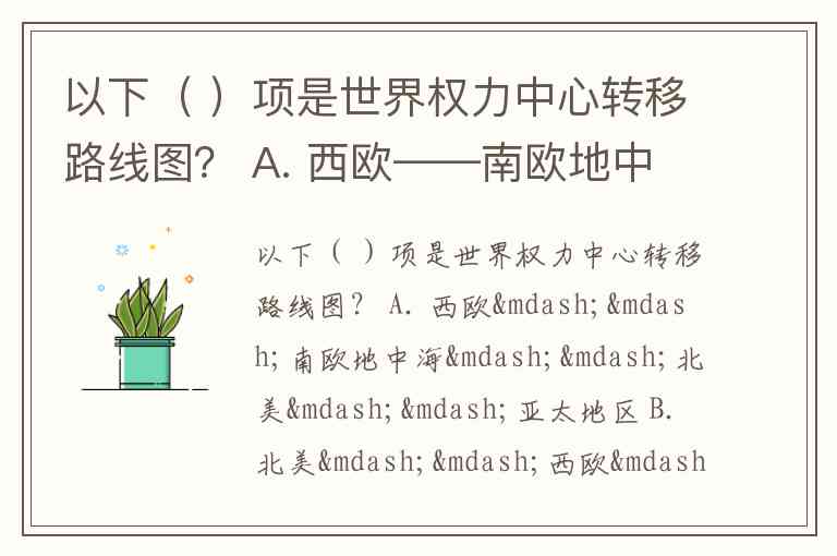 以下( )项是世界权力中心转移路线图? A. 西欧——南欧地中海——北美——亚太地区 B. 北美——西欧——南欧地中海——亚太地区 C. 南欧地中海——西欧——北美——亚太地区 D. 西欧——北美——南欧地中海——亚太地区