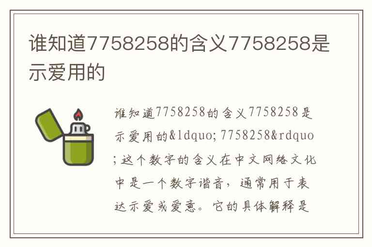 “7758258”这个数字的含义在中文网络文化中是一个数字谐音,通常用于表达示爱或爱意。它的具体解释是:
