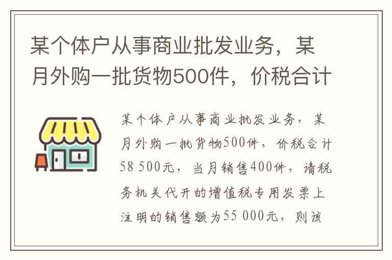 某个体户从事商业批发业务,某月外购一批货物500件,价税合计58 500元,当月销售400件,请税务机关代开的增值税专用发票上注明的销售额为55 000元,则该个体户应当缴纳的增值税为( )元。