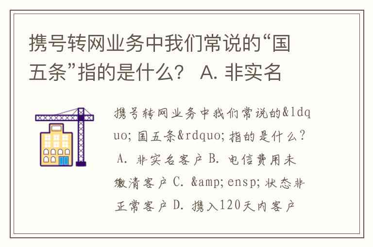 在携号转网业务中,常说的“国五条”指的是 电信费用未缴清客户。这个术语源于国家相关政策,针对一些未缴清费用或存在未结清债务的用户,限制其携号转网。