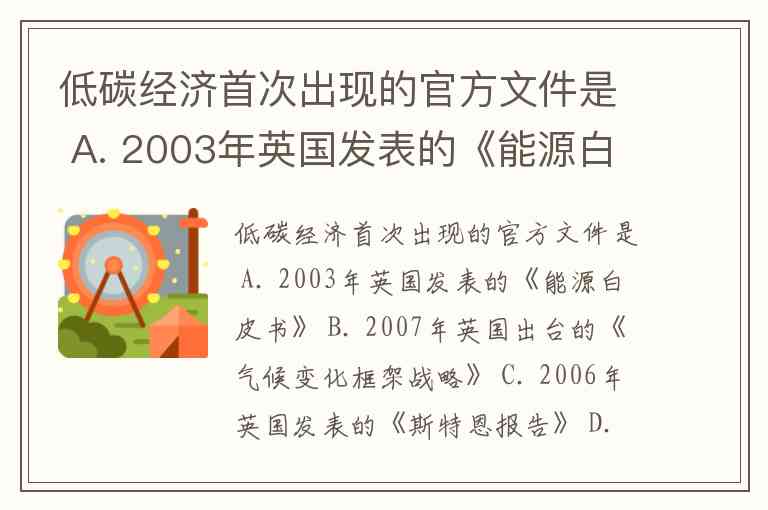 低碳经济首次出现的官方文件是 A. 2003年英国发表的《能源白皮书》 B. 2007年英国出台的《气候变化框架战略》 C. 2006年英国发表的《斯特恩报告》 D. 西班牙学者乌恩鲁2000年发表的《能源政策》