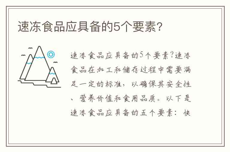 速冻食品在加工和储存过程中需要满足一定的标准,以确保其安全性、营养价值和食用品质。以下是速冻食品应具备的五个要素:
