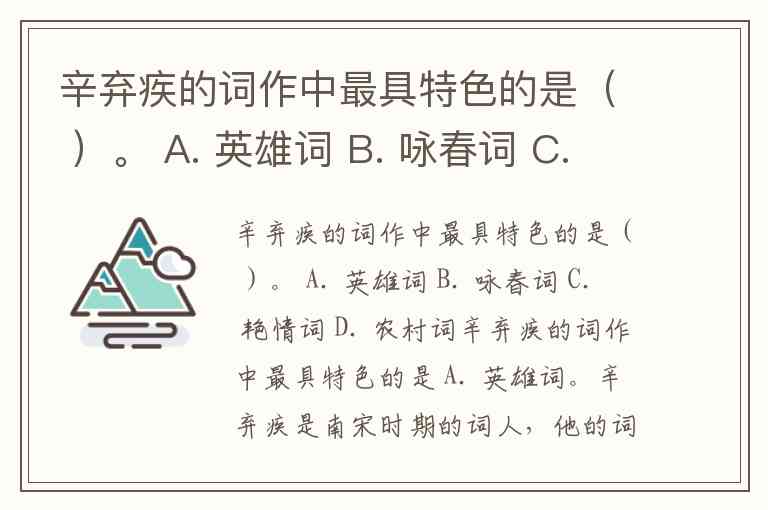 辛弃疾的词作中最具特色的是( )。 A. 英雄词 B. 咏春词 C. 艳情词 D. 农村词