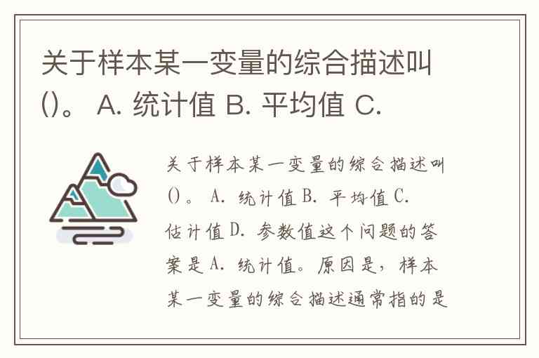 原因是,样本某一变量的综合描述通常指的是通过样本数据计算出来的值,它是统计学中用来总结样本特征的一个量,比如均值、标准差等,这些都可以称为统计值。其他选项的定义如下: