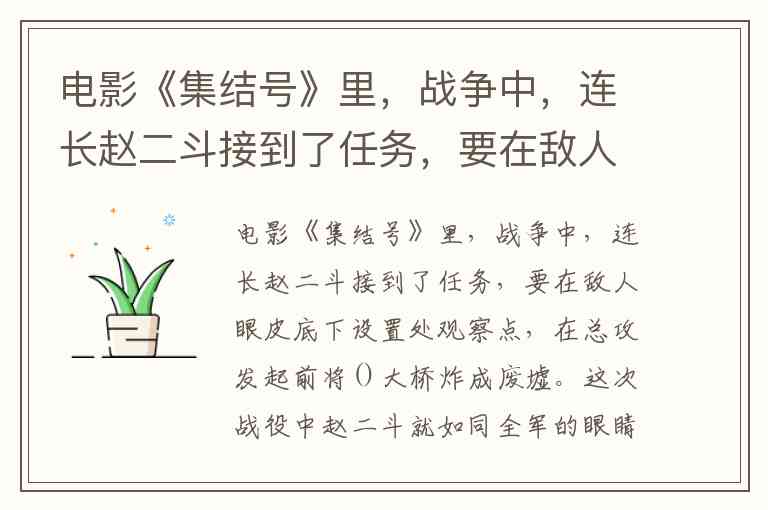电影《集结号》中,连长赵二斗接到的任务是要在敌人眼皮底下设置观察点,并在总攻发起前将大桥炸成废墟。赵二斗的角色被塑造得非常英雄,几乎是整个战役的“眼睛”,为全军提供重要的战术信息。