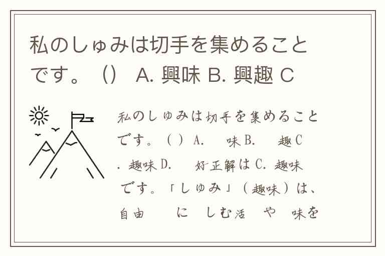 私のしゅみは切手を集めることです。() A. 興味 B. 興趣 C. 趣味 D. 愛好