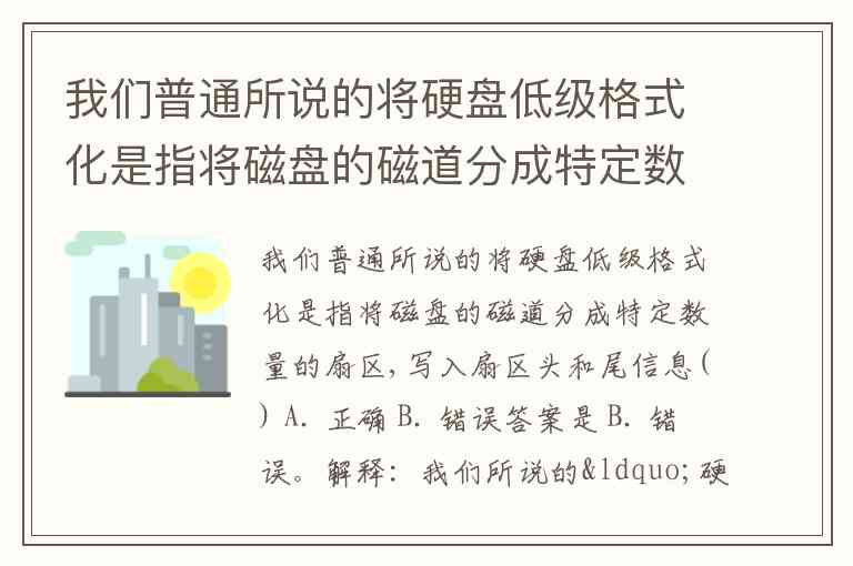 我们普通所说的将硬盘低级格式化是指将磁盘的磁道分成特定数量的扇区,写入扇区头和尾信息() A. 正确 B. 错误