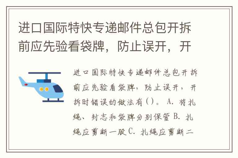 进口国际特快专递邮件总包开拆前应先验看袋牌,防止误开,开拆时错误的做法有( )。 A. 将扎绳、封志和袋牌分别保管 B. 扎绳应剪断一股 C. 扎绳应剪断二股 D. 先开袋牌上注有“F”字样的袋