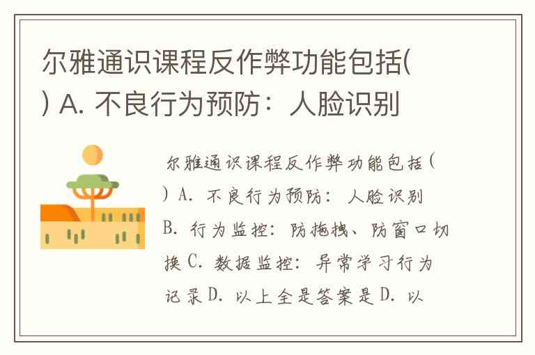 尔雅通识课程反作弊功能包括( ) A. 不良行为预防:人脸识别 B. 行为监控:防拖拽、防窗口切换 C. 数据监控:异常学习行为记录 D. 以上全是