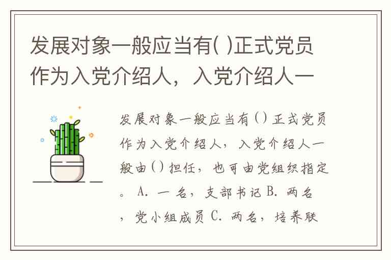 发展对象一般应当有( )正式党员作为入党介绍人,入党介绍人一般由( )担任,也可由党组织指定。 A. 一 名,支部书记 B. 两名,党小组成员 C. 两名,培养联系人 D. 两名以上,培养联系人