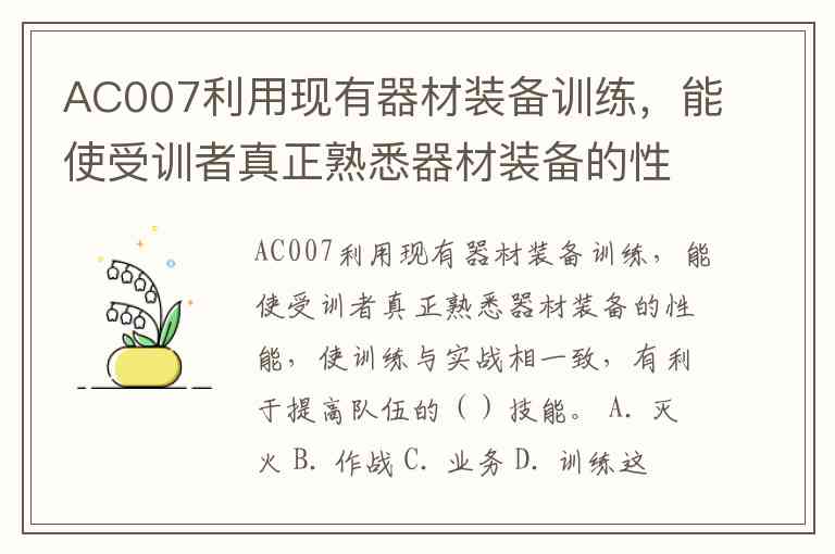 AC007利用现有器材装备训练,能使受训者真正熟悉器材装备的性能,使训练与实战相一致,有利于提高队伍的()技能。 A. 灭火 B. 作战 C. 业务 D. 训练