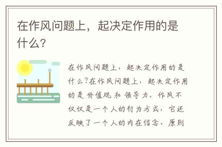 在作风问题上,起决定作用的是 价值观 和 领导力。作风不仅仅是一个人的行为方式,它还反映了一个人的内在信念、原则和对待事物的态度。在社会、工作或集体环境中,作风是由多个因素共同作用的结果,但有几个关键因素对作风起着决定性的影响: