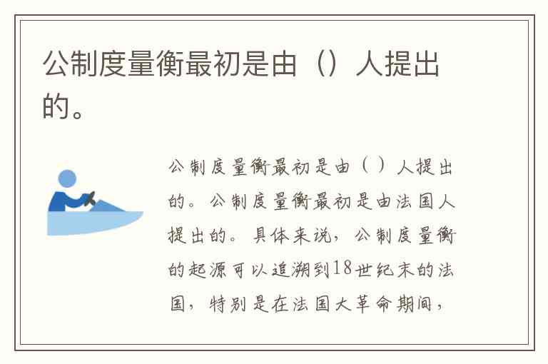 公制度量衡最初是由法国人提出的。具体来说,公制度量衡的起源可以追溯到18世纪末的法国,特别是在法国大革命期间,法国政府为了统一度量衡体系,提出了一个新的标准。这个体系的核心理念是基于科学和自然现象,采用了米、千克等单位,最终发展成为现代国际单位制(SI)。