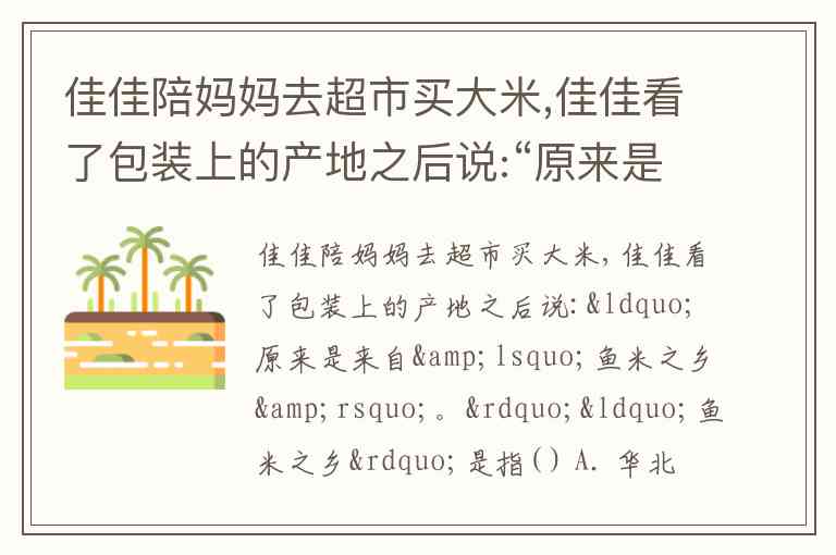 佳佳陪妈妈去超市买大米,佳佳看了包装上的产地之后说:“原来是来自‘鱼米之乡’。”“鱼米之乡”是指( ) A. 华北平原 B. 长江中下游平原 C. 四川盆地 D. 河套平原