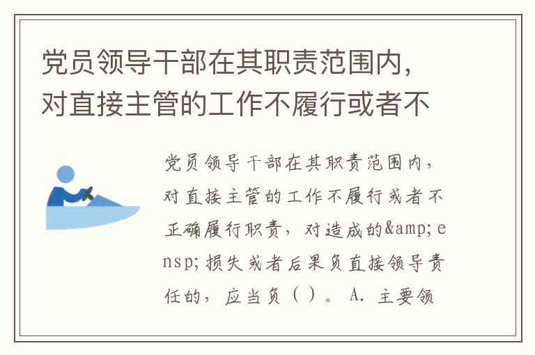 党员领导干部在其职责范围内,对直接主管的工作不履行或者不正确履行职责,对造成的 损失或者后果负直接领导责任的,应当负()。 A. 主要领导责任 B. 直接领导责任 C. 重要领导责任