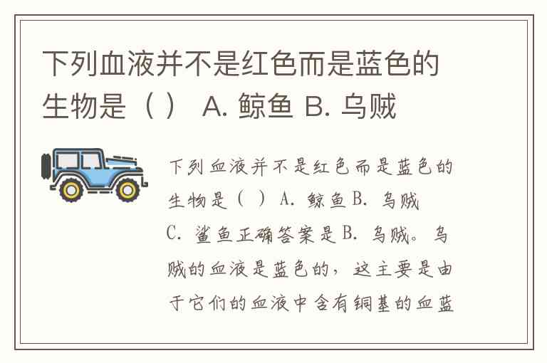 下列血液并不是红色而是蓝色的生物是( ) A. 鲸鱼 B. 乌贼 C. 鲨鱼