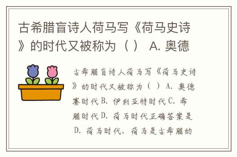 古希腊盲诗人荷马写《荷马史诗》的时代又被称为( ) A. 奥德赛时代 B. 伊利亚特时代 C. 希腊时代 D. 荷马时代