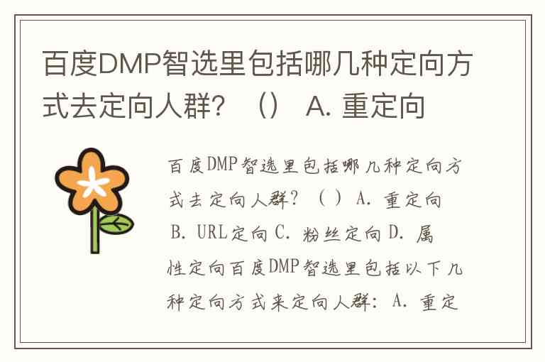 百度DMP智选里包括哪几种定向方式去定向人群?() A. 重定向 B. URL定向 C. 粉丝定向 D. 属性定向