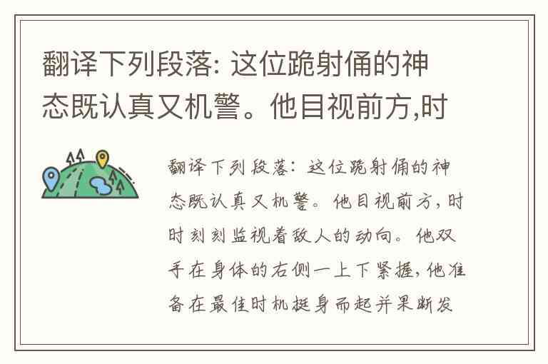 翻译下列段落: 这位跪射俑的神态既认真又机警。他目视前方,时时刻刻监视着敌人的动向。他双手在身体的右侧一上下紧握,他准备在最佳时机挺身而起并果断发射 弩箭。他头挽发簪,其胸部铠甲的设计更加周密,胸部以上的甲片为上片压下片,胸部以下则相反,整个铠甲的设计是中间的甲片压着两侧的甲片,这种设计法使士兵在战斗中全身运动自如。