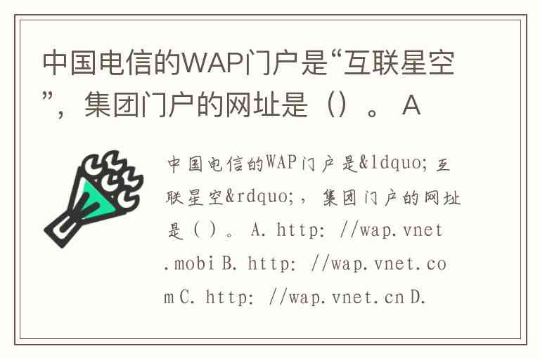 中国电信的WAP门户是“互联星空”,集团门户的网址是()。 A. http://wap.vnet.mobi B. http://wap.vnet.com C. http://wap.vnet.cn D. http://wap.vnet.com.c