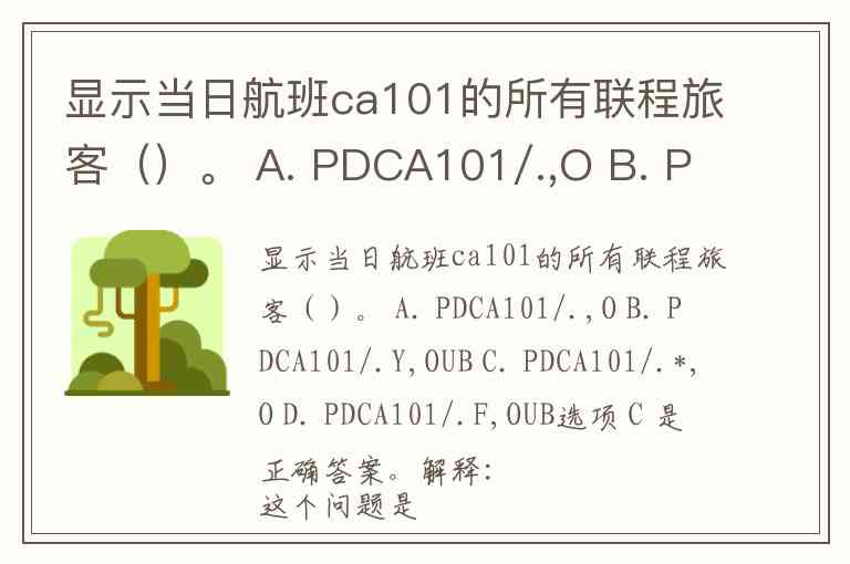 显示当日航班ca101的所有联程旅客()。 A. PDCA101/.,O B. PDCA101/.Y,OUB C. PDCA101/.*,O D. PDCA101/.F,OUB