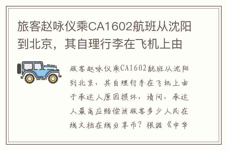 旅客赵咏仪乘CA1602航班从沈阳到北京,其自理行李在飞机上由于承运人原因损坏,请问,承运人最高应赔偿该旅客多少人民在线文档在线分享币?