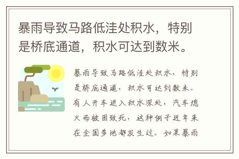 等待救援:如果遇到积水较深的区域,推车或试图启动车辆可能会增加风险。如果车辆熄火,并且外部水流较强,车主应该尽量保持冷静,打电话报警求助,等待专业人员的帮助。