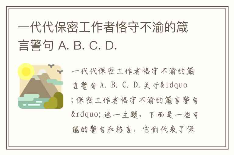 关于“保密工作者恪守不渝的箴言警句”这一主题,下面是一些可能的警句和格言,它们代表了保密工作的重要性、纪律性和对国家、集体责任的坚持。可以根据不同的文化或组织背景,调整以下警句的具体内容: