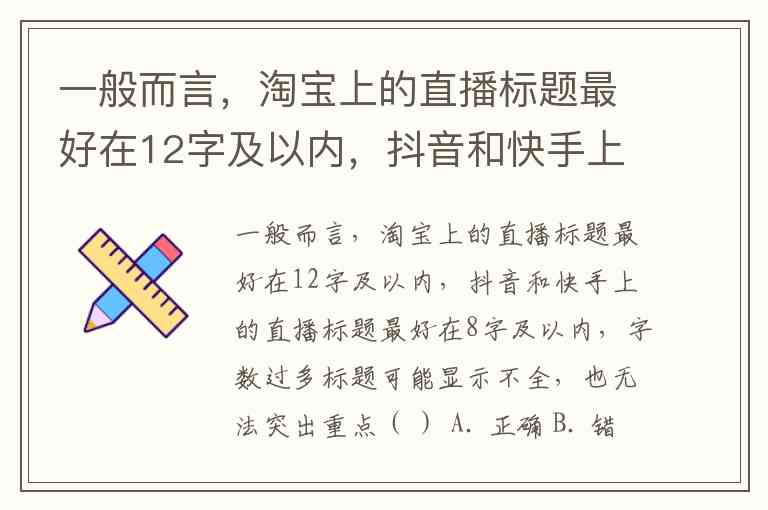 一般而言,淘宝上的直播标题最好在12字及以内,抖音和快手上的直播标题最好在8字及以内,字数过多标题可能显示不全,也无法突出重点( ) A. 正确 B. 错误